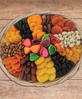 Premium Basket filled with Premium Fruits, Nuts, and foil covered Milk Chocolate Leaves ~ California Apricots, Mediterranean Apricots, California Angelino Plums, California Peaches, Pears, California Pitted Prunes, California Deglet Dates, Roasted and Salted California Pistachios, Roasted and Salted California Almonds, and an assortment of foil covered Milk Chocolate Leaves.