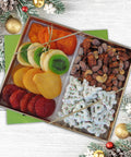 Festive Holiday gift box! A fanciful arrangement of Dried Fruits, Nut Medley Mix and festive frosted Pretzels all in a decorative gift box. The gift box is filled with a sweet assortment of California Angelino Plums, California Yellow Peaches, Sweet Pears, Apple Rings and Kiwi slices side by side with a Honey Roasted & Glazed Nut Medley Mix (Cashews, Almonds and Pecans) and Yogurt Frosted Pretzels. Treat someone to a festive gift box that they will rave about!